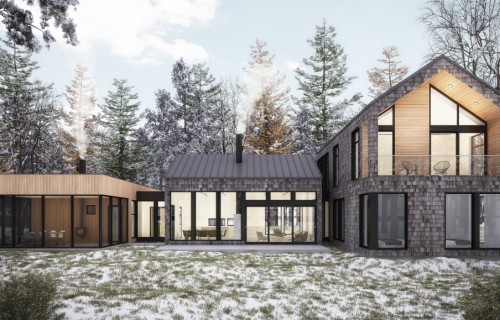 This inspiration combines the tactile pleasure of traditional rural surfaces with the style of modern contemporary living. It features two volumes, one a main living space on two floors with a fireplace as a focal point, the other a broad horizontal volume containing the garage, some service areas, an office and master bedroom. Oversized windows allow light to flood the interior spaces and provide outstanding views of the surrounding nature.