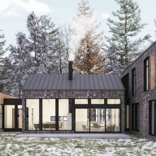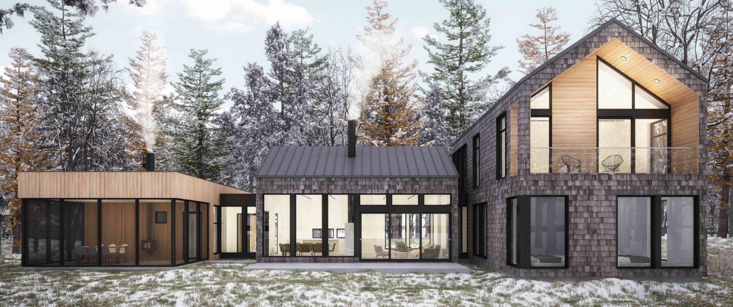 The main living space is a huge 25′ x 30′, with a kids’ play area plus two bedrooms. All three volumes are connected by glass breezeways as a link between nature and coziness. Oversized windows in the upper floor’s spacious master bedroom connect the interior space with the great outdoors. But if you want to actually go outdoors, there’s also an adjoining carved-out balcony patio. A mudroom, laundry and powder room are connected to the 2-car garage and storage space.