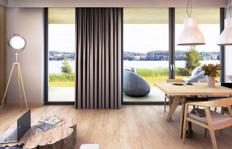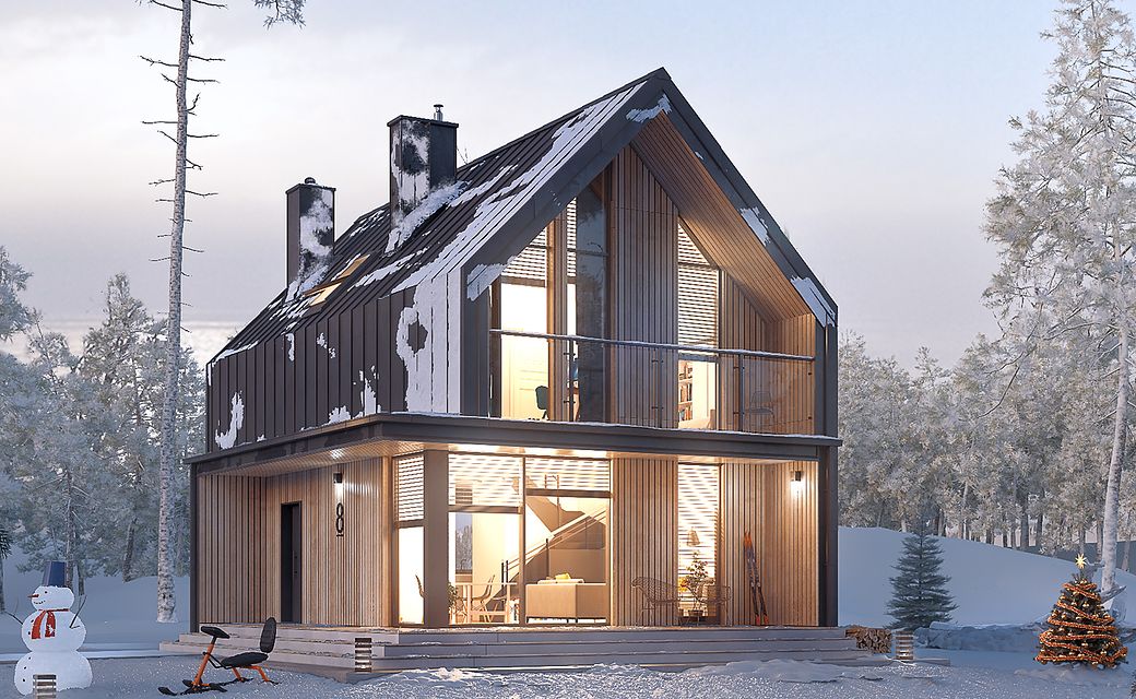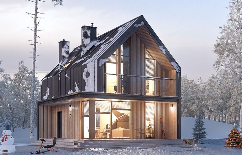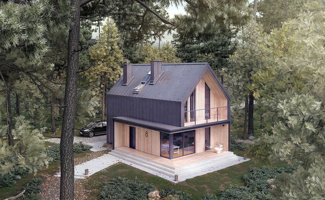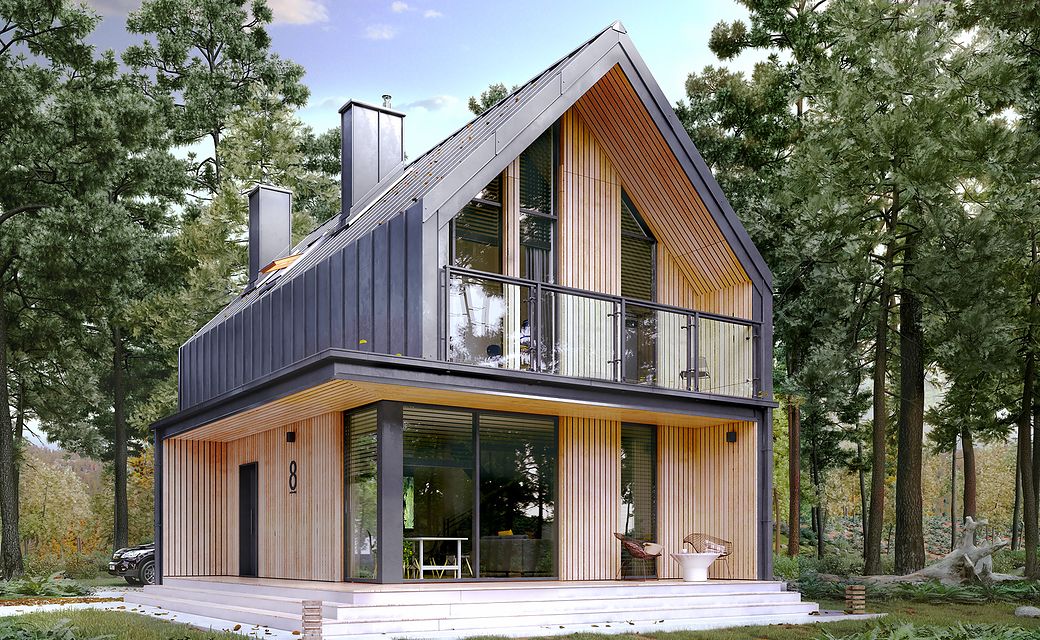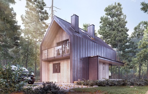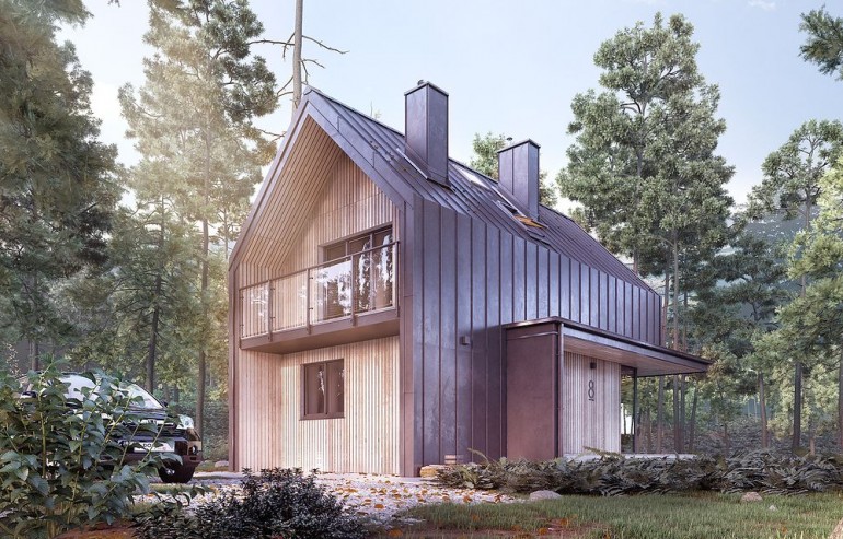 It is a tiny house design with a usable attic, characterized by a modern shape and a functional, for a small area, arrangement of rooms. The shape is simple and compact. It is finished with a standing seam sheet and large glazing in the tops of the building, which makes it look very modern. Carefully developed proportions, subdued colors and natural finishing materials make the house look attractive and minimalist.
