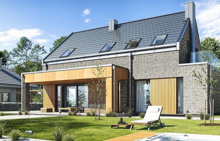 The Rumba house plan is a new version of the project belonging to the group from the series of houses derived from the "Party" project, which together form a collection of "dancing" houses, that is: Party, Party 2, Biba, Fokstrot, Salsa, Samba, Tango. The design of the Rumba house was designed on a functional plan similar to the aforementioned houses, but its style is completely different, original. The entire body of the building is finished with one material - all walls are covered with clinker tiles. Window openings widened with additional cladding made of wood create cutouts in this uniform brick block. A gable roof made of flat tiles, without eaves, completes the composition. The design of the Rumba house is modern, original and will surely stand out from dozens of similar houses - roofers. At the same time, the finishing materials used bring to mind: elegance, decent workmanship, durability and longevity of the building. This effect was achieved despite the relatively low cost of building the house. The Rumba house plan has a very simple shape and structure - it will be easy and relatively cheap to build. The interior of the house: on the ground floor there is an open living space of the combined living room, hall and kitchen. A kitchen with an island, a wall fully built-in household appliances, with a front window reaching the floor will decorate the living space. The living room with a wide fireplace and TV wall opens onto the surrounding garden and partially covered terrace with large glazing. The other rooms on the ground floor are a room (office or an additional bedroom), a bathroom with a shower and a storage compartment under the landing of the stairs, a pantry between the kitchen and the vestibule, and a double garage and a boiler room. In the attic, we have three bedrooms, including: parents' apartment with a bathroom, dressing room and own terrace, and two children's bedrooms with built-in wardrobes, separate bathroom and laundry room. In a small area of the house, it was possible to design a very comfortable interior for a family of 4-6 people. The Rumba house design is an excellent proposition for brave investors who want to stand out in a smart way. A consistently implemented project will be an attraction among the surrounding buildings and certainly no one will pass by such a gem indifferently. Welcome!