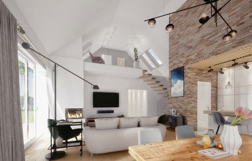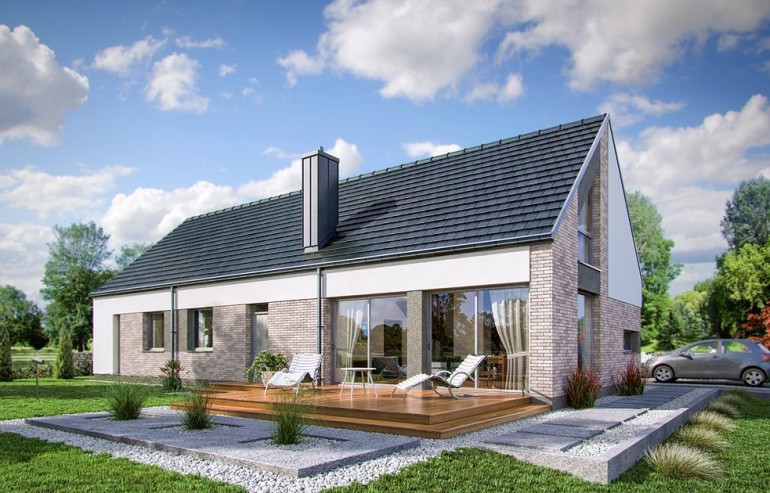 DOMENY 123 is a project for a family of 4-5 people, created for a narrow plot. The vestibule with space for a wardrobe opens onto the day zone, consisting of a spacious living room with a dining area and an easy to separate kitchen with a pantry. From the corridor, we have access to two rooms, a bathroom, a laundry room and a master bedroom with a wardrobe and another bathroom adjacent to it. The stairs lead to the mezzanine from which there is access to the attic. A large unused attic can be easily adapted for utility purposes, for example as additional rooms. The standard design has an additional fireplace heating design with a water jacket. Visualization is a proposal of how a given house design and its surroundings can be arranged. The method of running the terrace, the shape of the walls and elements of small architecture such as pergolas, pots, etc. are not included in the scope of the project. Therefore, in the construction design, these elements may not be included in the design (see pergolas) or their shape and method of running (size of terraces, wall profile) may be changed.