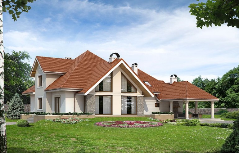The Artemida house plan is an interesting proposition for people with a plot of medium width. The house has a typical shape, so its implementation will not require too much financial resources. It is intended for investors who have a plot of land that allows for the implementation of a free-standing project. The author of the project envisaged a double garage in the line of the building. It is also an excellent proposition for people looking for a house with a tent roof that perfectly protects the building against unfavorable weather. The Artemida project is a one-story house with an attic, thanks to which the household members can enjoy more privacy. The heart of the house is a spacious day zone, which is conducive to spending time together with your loved ones. It is created, among other things, by a functional kitchen that will fulfill the dream of every hostess. The living area includes a living room and a dining room, making the interior of the house very functional. The fireplace located in the living room not only looks great, but also provides pleasant warmth on cooler days. Five comfortable rooms will meet the needs of a family of 5-7. The space can also be used as a guest room or office. Certainly, every lady of the house will appreciate the advantages of the wardrobe provided for in the design. In addition to this, the house also has a utility room that you can use according to your needs. The mezzanine included in the design gives the interior a unique character. The terrace next to the house is perfect for spending time outdoors. The house was designed in brick technology. Its appearance refers to the traditional style, which is an ideal solution for people who value classics and simplicity.