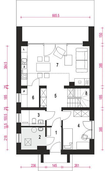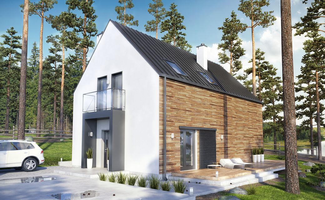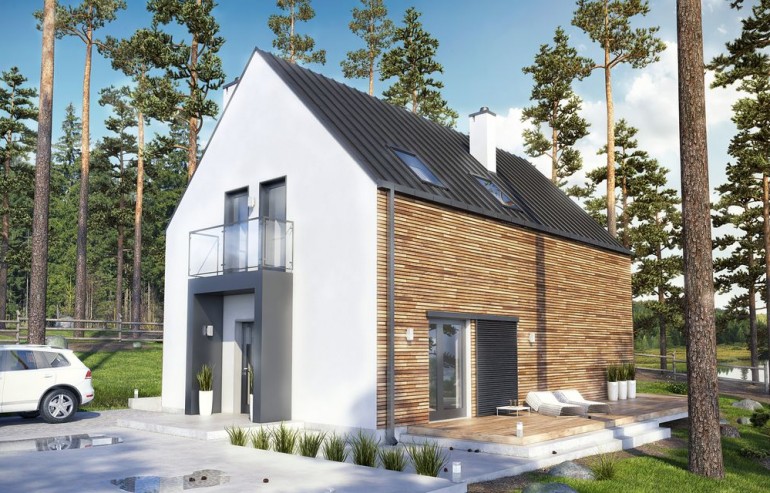 A design of a modern home, perfectly in line with the trends, original and extraordinary. This is Vikka, a unique Scandinavian-style house, an impressive modern barn, perfect for a family that values functionality and design. Large glazing guarantees a great view of the space surrounding the house and natural light in the rooms. Vikka is a project for people who want a practical and beautiful home, who like economy in form, modern design, elegance, a combination of natural materials and colors. The house consists of the ground floor and the attic, as well as a small balcony and a large terrace. The total area is 87.5 square meters, of which 56.5 is the ground floor and 31.2 is the first floor. On the ground floor there is a large living room with a kitchen, a room that can act as a study or an additional bedroom, bathroom, boiler room and pantry. Entering the first floor, we see a mezzanine overlooking the living room and the terrace behind its windows, and two bedrooms and a bathroom. What distinguishes the Vikka project is certainly a perfectly lit, glazed living room, a room on the ground floor, two comfortable bathrooms, wood on the facade and a mezzanine above the living room, which give the character of a modern shape. Vikka is a house design that will meet the expectations of a 2 + 1 or 2 + 2 family. Three closed bedrooms, as well as a large living room, where most of your free time is spent, will make everyone feel at ease. The division into day zones on the ground floor and night zones on the first floor allows you to maintain peace and balance when you need it. The impressive terrace surrounding Vikka is an extension of the living room and will be a perfect place to meet friends or rest.