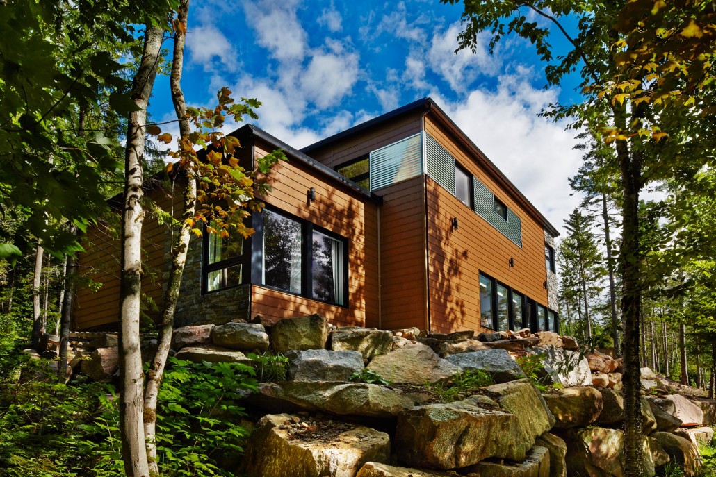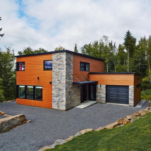 This beautifully proportioned small house in the country is surrounded by trees and sits on a steep terrain. The owners, a couple with teenaged children, use it as a cottage getaway. The ample fenestration covering most of the exterior facades gives the impression that they are truly living in the forest, with daylight streaming in all day long. Inside, both floors have high ceilings and there’s a large living room where the family can relax in peace. Straightforward design and an adjoining garage make this a real home away from home.