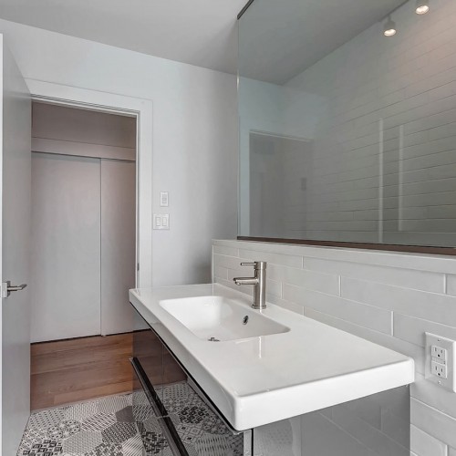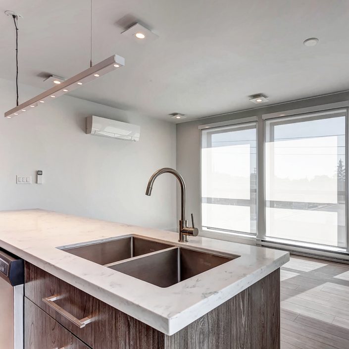 Located on a very narrow lot, this JNCN HOMES custom designed multi-residential building takes full advantage of all the natural light and environment. The 20’ wide building will have three residential units of 924 sq.ft. each on 3 levels and a fourth unit of 898 sq.ft. in the basement. All units have two bedrooms, a bathroom and an open-concept kitchen with living room highlighted by floor to ceiling windows.