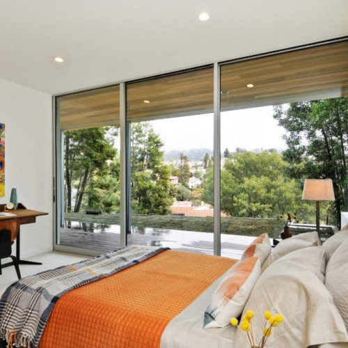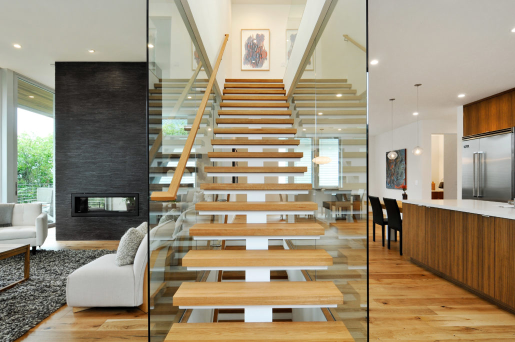 Main level has an expansive open floor plan with lovely views. The glass-enclosed stair and see-through fireplace, coupled with 12 foot high sliding doors and 40 foot wide deck, make this a perfect home for entertaining while remaining private and sheltered among the trees.
