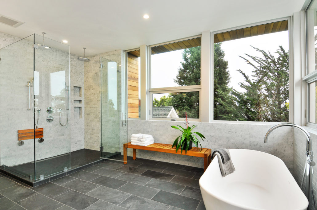Four and a half baths with custom walnut vanities.